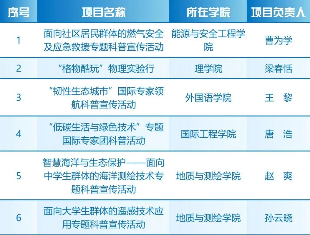 此次获批的项目涵盖了能源安全、生态城市、绿色低碳、海洋测绘及遥感技术、物理学等多个研究领域,体现了学校在不同领域的科研优势和科普潜力。此次获批的2项外国专家科普活动专题项目邀请了我校国际工程学院的多位国外教授共同开展科普活动,充分体现了学校国际办学优势。这些项目将围绕燃气安全及应急救援、韧性生态城市、低碳生活与绿色技术、智慧海洋与生态保护、遥感技术应用、物理实验教学等学科方向展开,旨在通过科普活动、展览展示、科普作品创作等多种形式,向公众普及科学知识,提升公众科学素养。学校将充分发挥自身学科优势和科研力量,精心组织项目实施,确保项目取得预期成效。