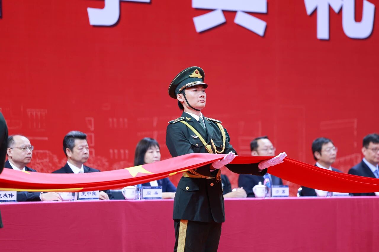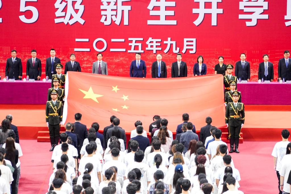 典礼伊始,学校国旗护卫队护送天安门广场国旗到舞台中央,全体起立并高唱国歌。这面凝聚着国家尊严与民族精神的旗帜,见证了中华民族不屈不挠的奋斗历程,更承载着中华民族伟大复兴的光荣梦想,也必将激励着2025级新生奋勇向前、挺膺担当,努力成为堪当民族复兴重任的时代新人。