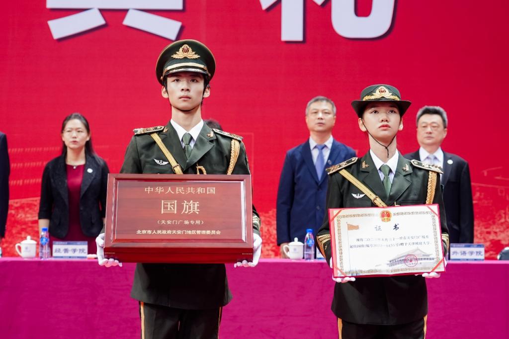 今天护送的国旗长5米,宽3.3米,编号“2023—0151”,是2023年5月31日我校建校45周年暨更名大学10周年校庆纪念日当天,在天安门广场升起的五星红旗,具有唯一性,这也是天津市属高校首次获赠,意义非凡,弥足珍贵。