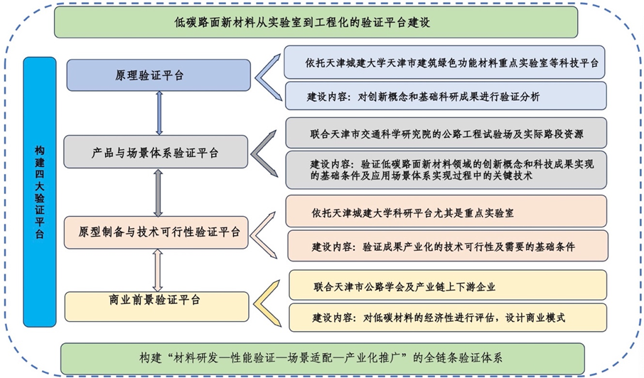 低碳路面新材料概念验证平台依托高校、研究院、学会和大型央企资源,聚焦国家“双碳”战略,瞄准交通基础设施绿色化、低碳化、高性能化的迫切需求,旨在建设天津市首个低碳路面新材料概念验证平台。通过整合高校基础研究优势、产业界工程化能力及行业学会资源,构建“材料研发-性能验证-场景适配-产业化推广”全链条验证体系,突破低碳路面材料从实验室到工程应用的“死亡之谷”,为推动天津市低碳路面新材料产业的高质量发展做贡献。
