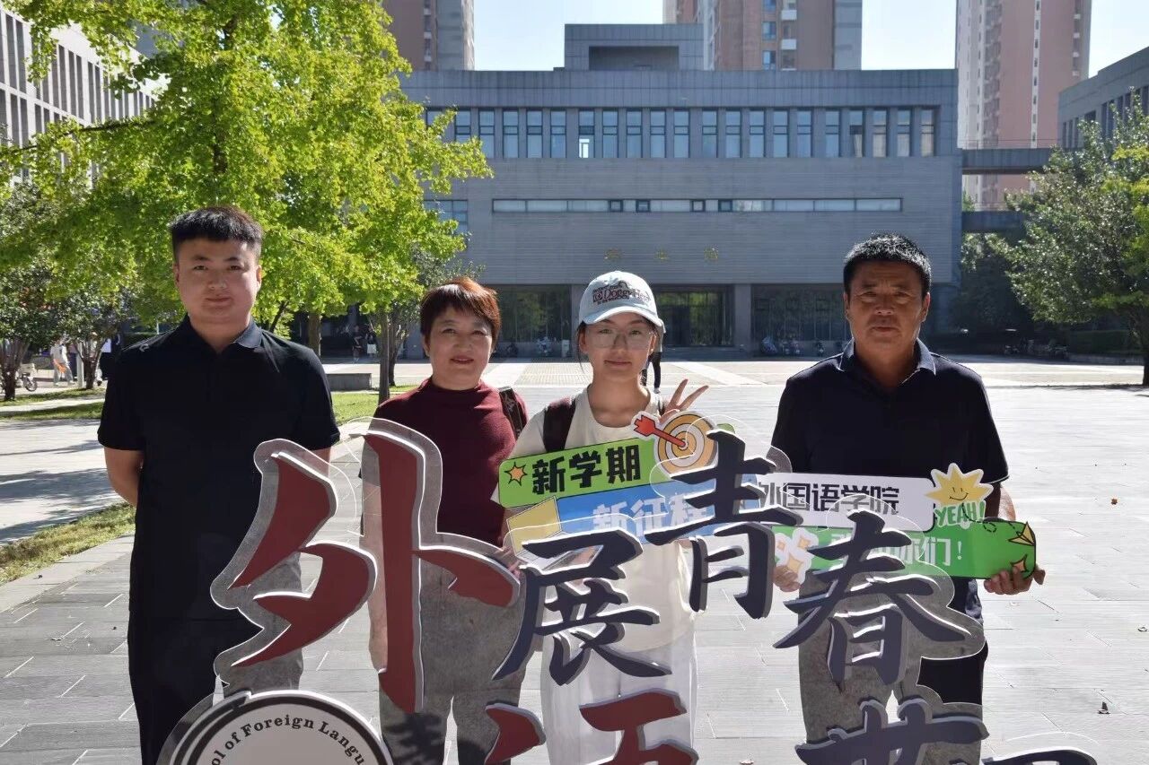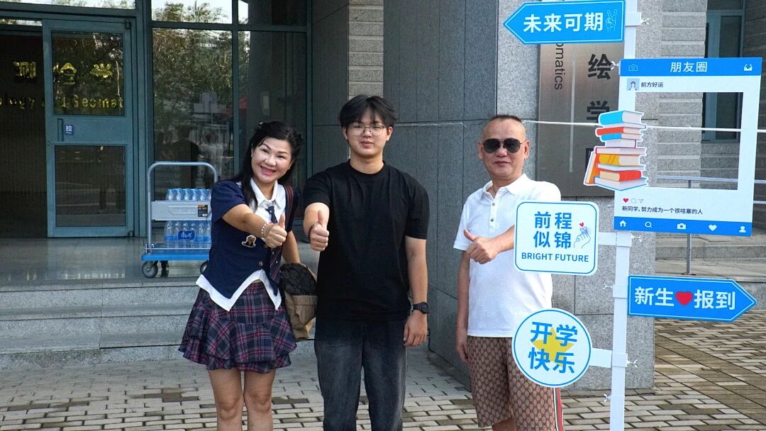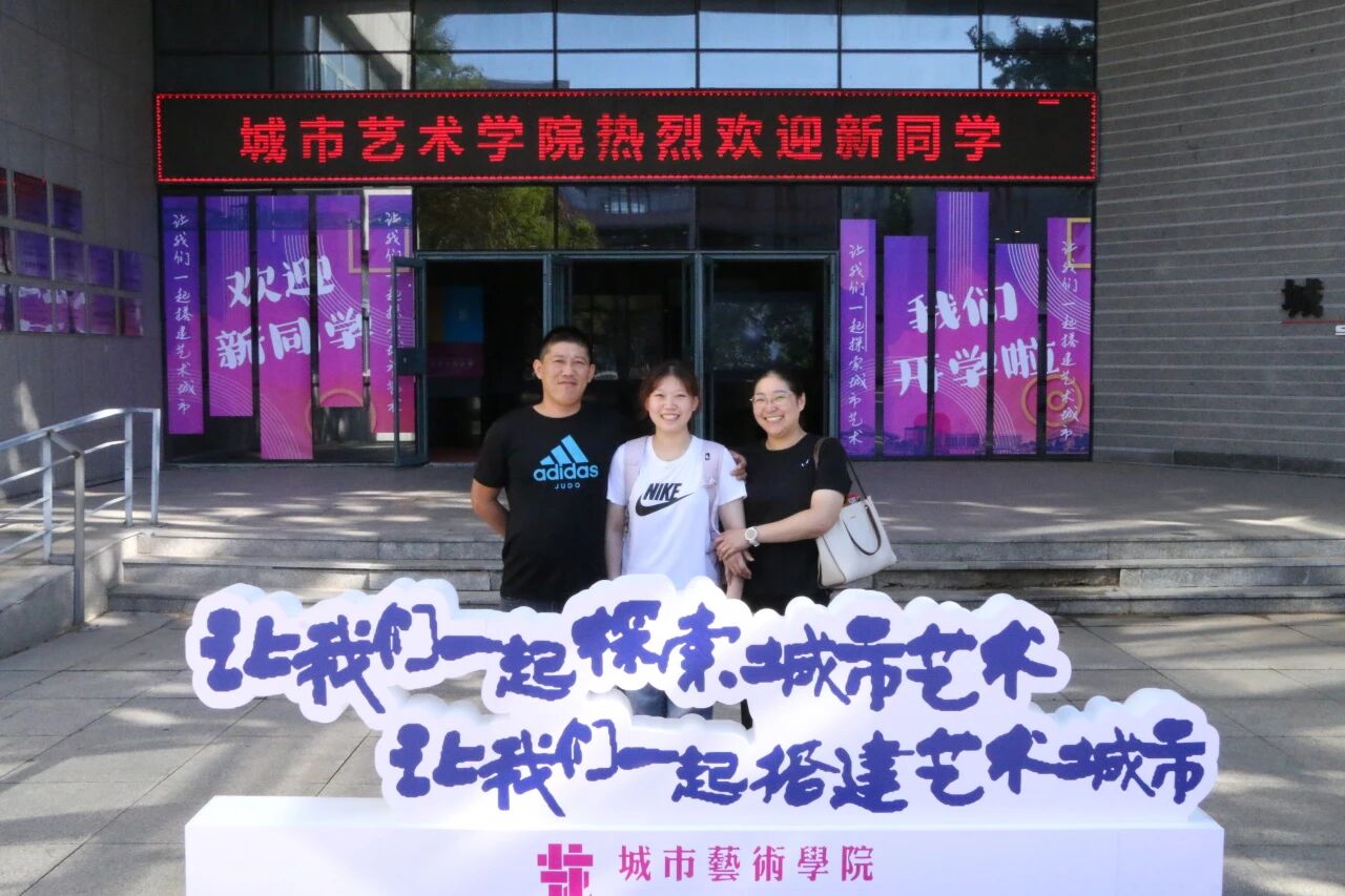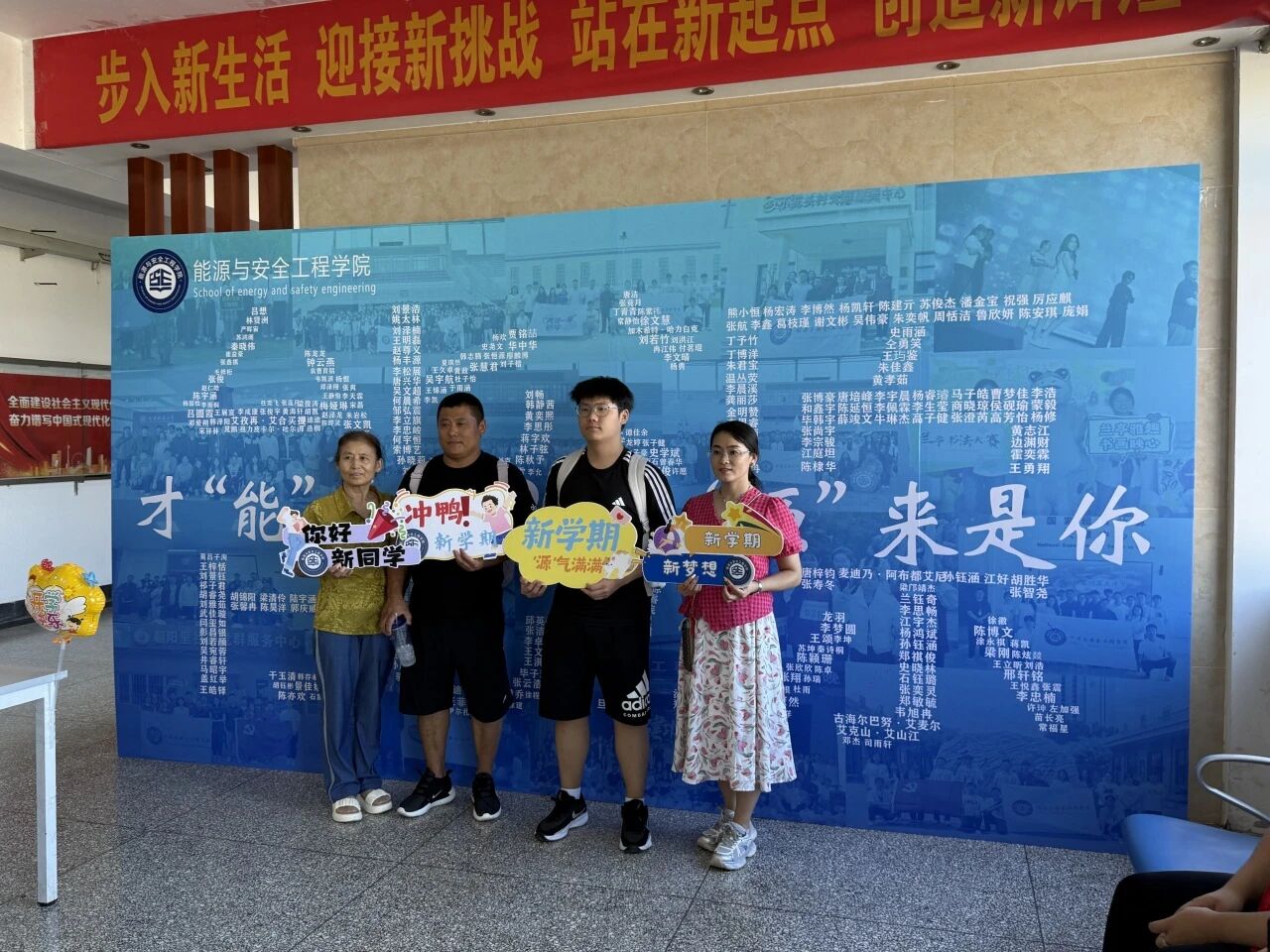 新生与家长们在背景墙前驻足