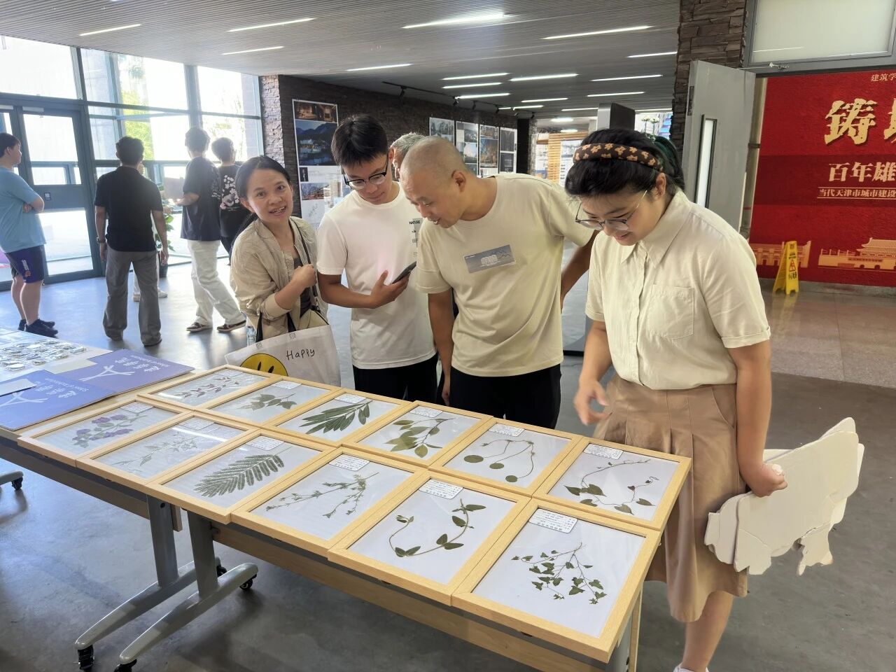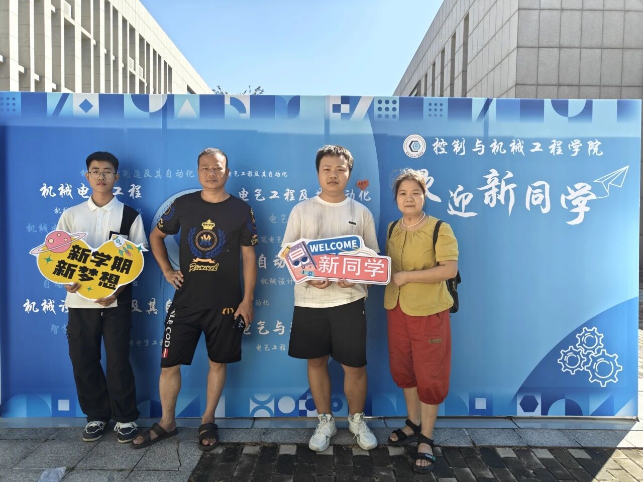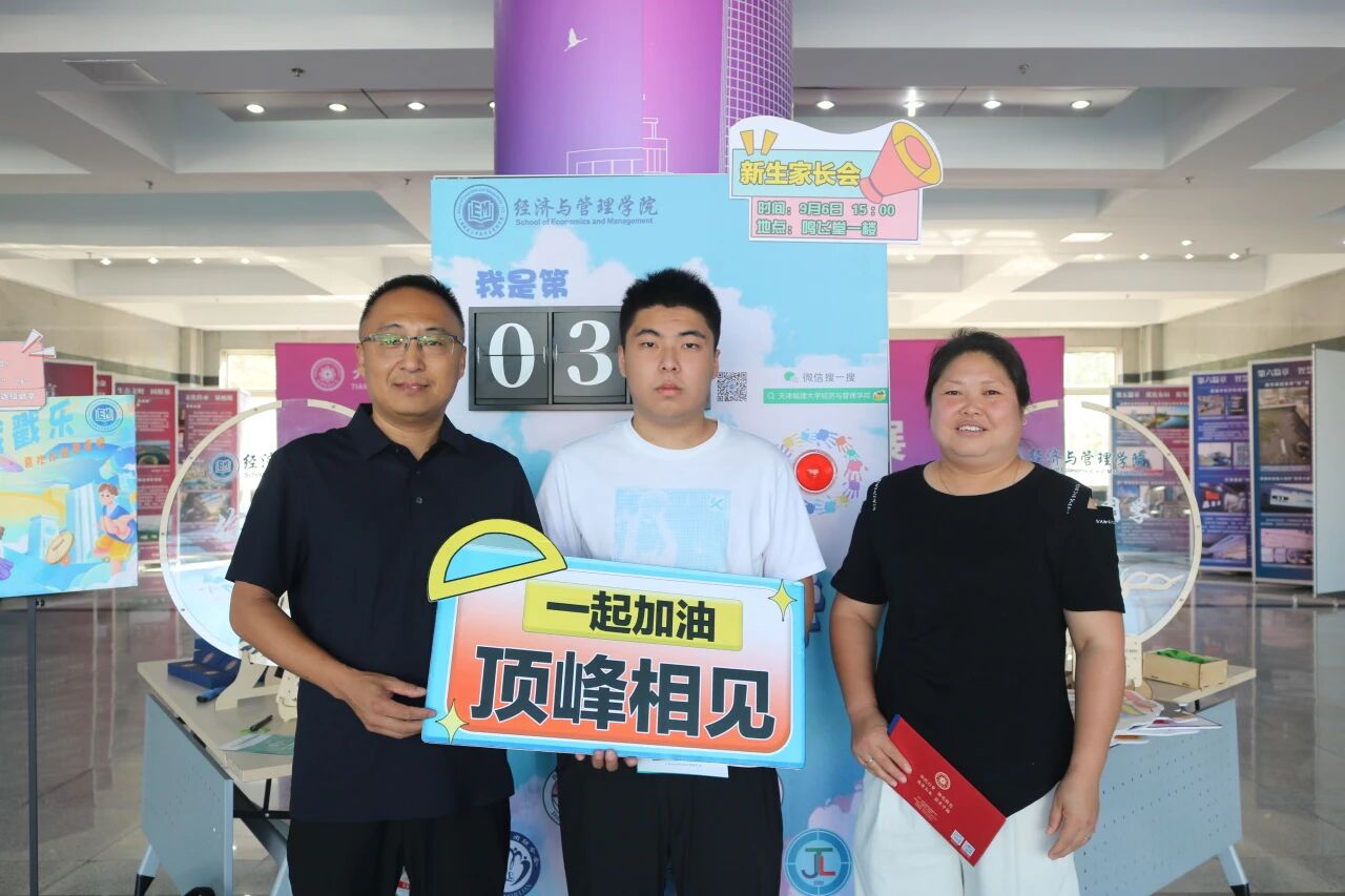 新生与家长们在背景墙前驻足