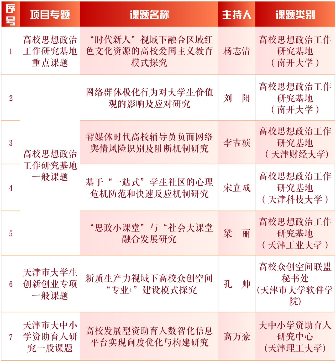 近日,市教育两委公布了2024年天津市大中小思想政治工作专项课题结项和2025年大中小思想政治工作专项课题立项名单。经专家组评审,我校7项课题顺利结项;在2025年度大中小思想政治工作专项课题中,9项课题成功获批立项,其中重点课题2项,一般课题7项。
