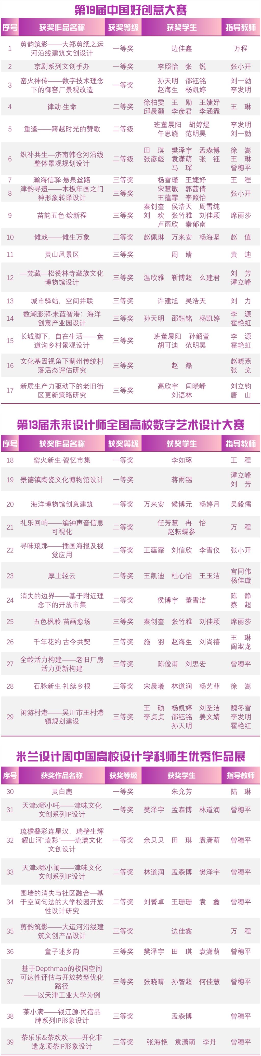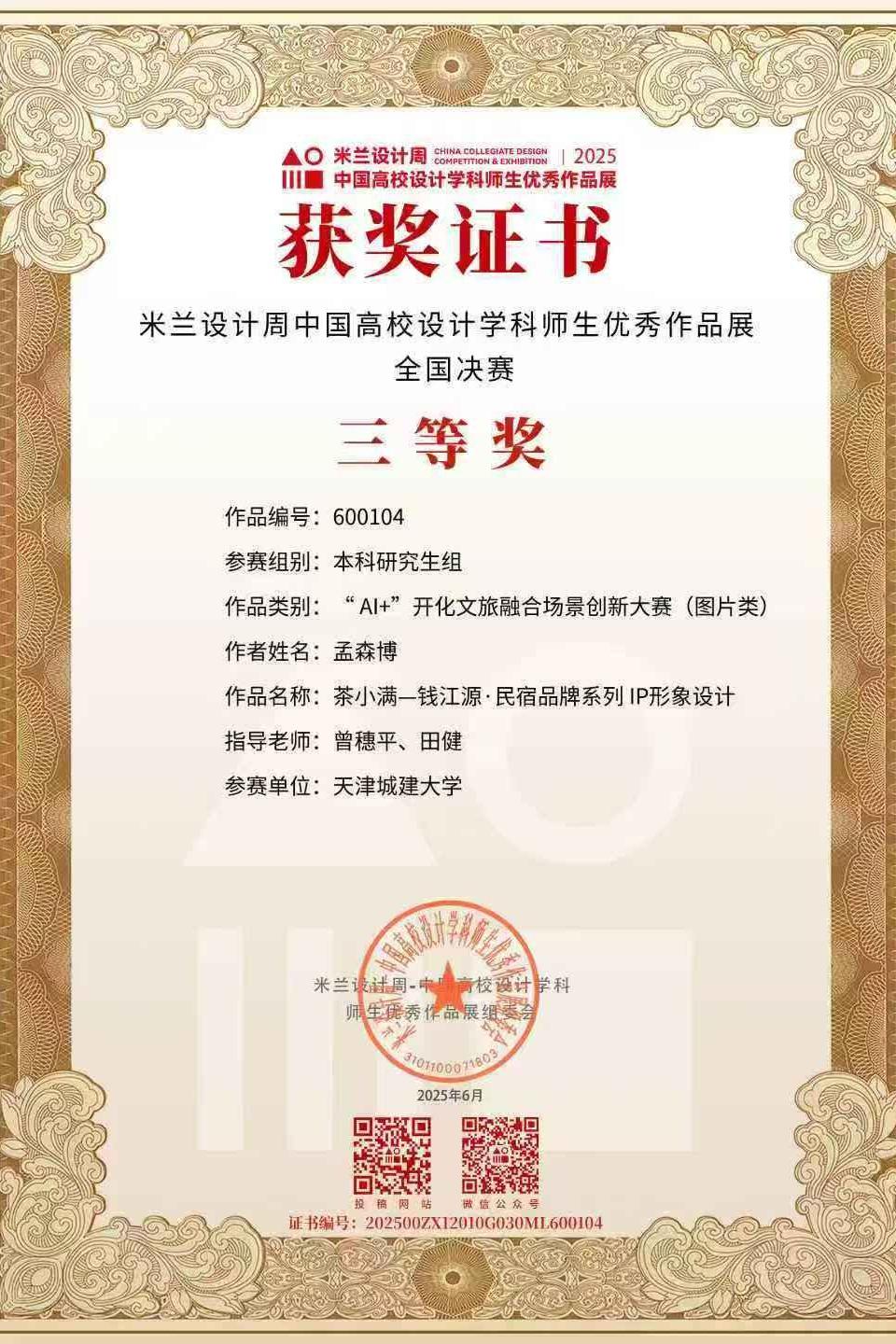 每一份荣誉的背后,都是学子们才华与汗水的结晶,更是学校教师深耕人才培养沃土的丰硕成果。一直以来,学校始终秉持“以赛促学、以赛促教、以赛促创、以赛促用”的教育理念,将学科前沿赛事与课堂教学、实践创作有机融合,系统构建高水平创新实践平台,全面激发学生的创新潜能与实践能力。此次在多项权威赛事中取得优异成绩,不仅充分展现了同学们扎实的专业素养与综合能力,更是学校持续推进人才培养模式创新、教育教学质量稳步提升的生动体现。未来,学校将坚定不移地践行立德树人使命,持续深化人才培养模式创新,以更高的标准、更实的举措,全面提升教育教学质量与学生的核心竞争力,助力天城大学子在更广阔的舞台中放飞青春梦想,成就精彩人生。