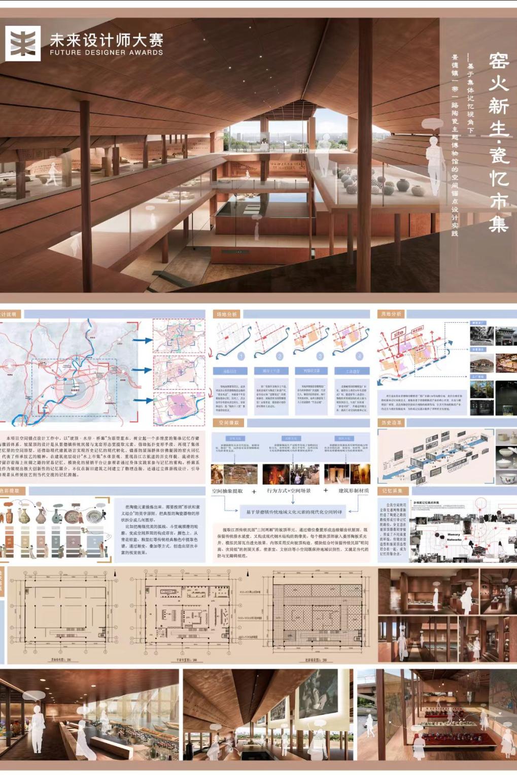 作品以集体记忆理论为框架,聚焦景德镇陶瓷博物馆这一工业遗产空间,探讨如何借“空间锚点”策略实现文化记忆的传承与创新。设计提取坡屋顶、龙窑形态、水道市集等在地元素,采取了“新旧共生”的策略:既保留工业遗存作为记忆载体,又运用拓扑变换原理构建坡屋顶群落和架空水道,重塑记忆场域。通过四大工序展区的场景复原与数字交互,构建“技艺器物人文”三重记忆唤醒机制;并以“陶瓷之路”多标高连廊串联空间,形成记忆流动网络,最终建立起“记忆拓扑”式的文化传承模式,为“一带一路”遗产的在地转译与活化提供了创新范式。