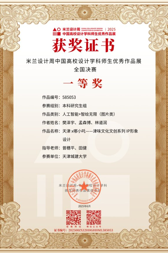 设计以神话人物“哪吒”为原型,融合天津三大文化基因——饮食、曲艺与漕运记忆,塑造出一位兼具童真、英气与烟火气的城市守护童神“哪小吒”。形象设计中,十八街麻花作风火轮、包子蒸笼演绎为乾坤圈、火尖枪融入快板元素,勾勒出既富中国风韵、又洋溢津门特色的视觉符号体系。借助AI生成工具高效拓展角色场景与风格演绎,探索“人工智能+设计”的创新路径,回应新质生产力背景下文化表达的革新需求。作品延伸至明信片、表情包、墙绘及衍生品等多种载体,构建出可传播、可共创的城市文化IP生态,以设计激活文化,以科技赋能创意,展现中华优秀传统文化在数字语境中的转化与生长。