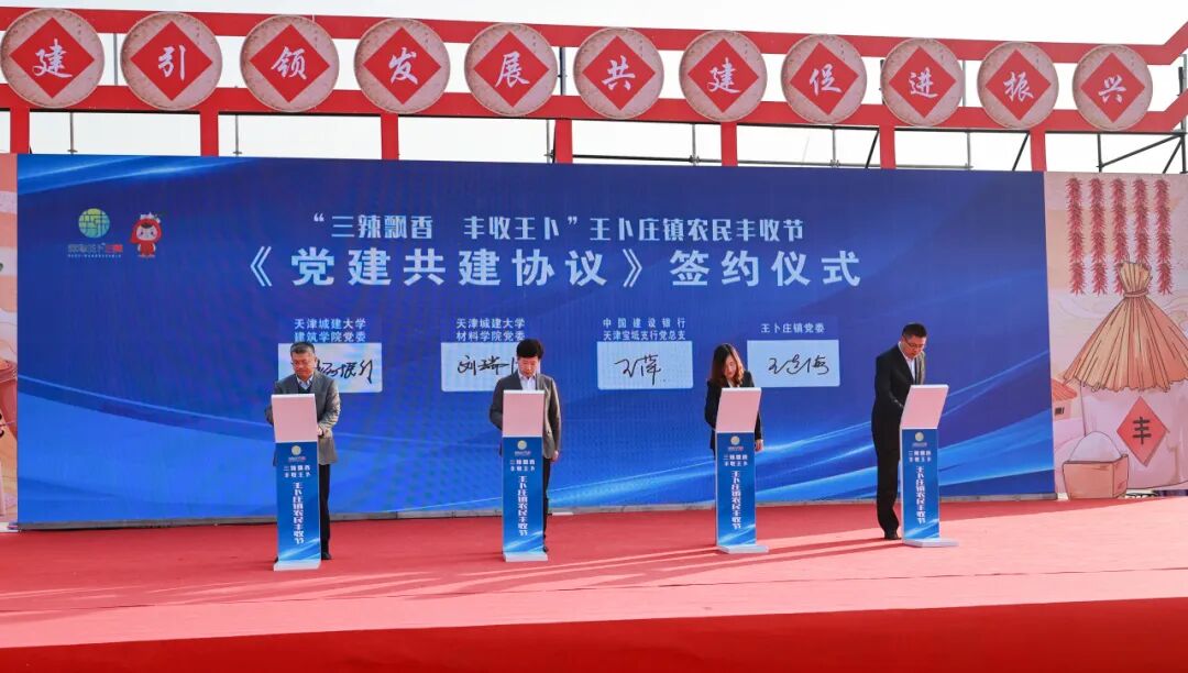 此次活动不仅是丰收的庆典,更是校地合作迈向深入的里程碑。在与会领导的共同见证下,我校建筑学院党委书记杨振舰、材料学院党委书记刘瑞江与王卜庄镇党委书记王连海共同签署了《党建共建协议》,标志着三方以高质量党建引领高质量发展的合作进入新阶段。