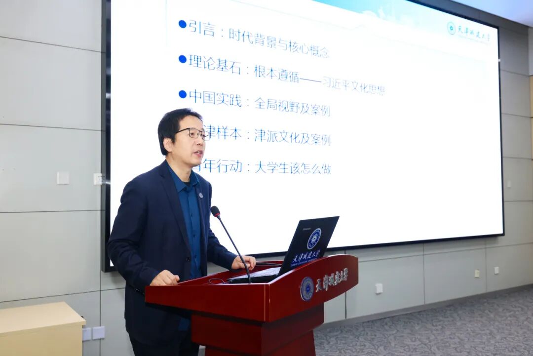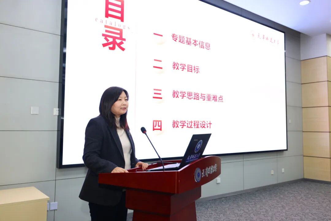 在教学设计展示环节,三位授课教师紧扣城建特色,从不同维度展示了教学设计。城市艺术学院院长张小开教授以《习近平文化思想引领城市文化建设》为题,创新采用“三层次、案例式”教学法,通过深挖天津历史街区、国家动漫产业园等津派文化案例,生动诠释了文化如何为城市“铸魂、塑城、兴业”,引导学生从城市文化的旁观者转变为参与者、传承者。