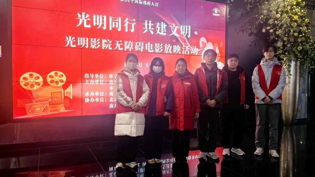 在第34个国际残疾人日到来之际,由市文明办指导,南开区委宣传部、市盲人协会、市电影家协会与中国传媒大学联合举办的“光明同行 共建文明”无障碍观影活动在天津莱纳星影城温情启幕。我校马克思主义学院高建华老师带领《志愿天津》课程的学生担任志愿者,以“一对一”全程陪护的方式,用青春力量为50余名视障人士搭建起通往光影世界的温暖桥梁——从爱心接送站到现场引导,从细心关照到温馨送归,以实际行动传递城市文明温度。