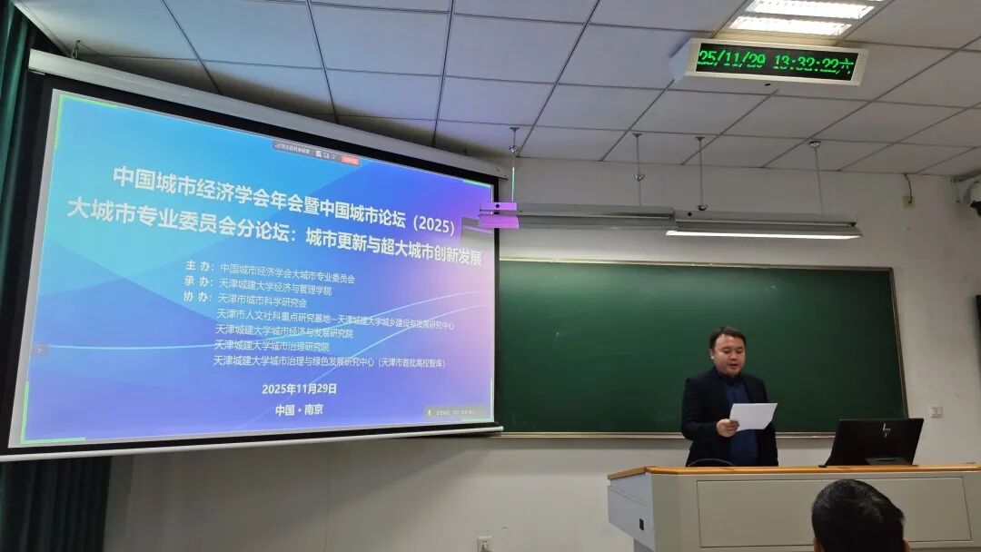 近日,由中国城市经济学会大城市专业委员会主办,我校经济与管理学院承办的“中国城市经济学会年会暨中国城市论坛(2025)大城市专业委员会分论坛”在东南大学成功举办。此次分论坛聚焦“城市更新与超大城市创新发展”主题,来自南开大学、北京师范大学、兰州大学、华东师范大学、西南财经大学、天津社会科学院、重庆社会科学院、深圳市社会科学院、东北财经大学、首都经济贸易大学、湖南工业大学、浙江工商大学、西北师范大学、内蒙古师范大学、江苏省战略与发展研究中心、南京江旅睿达产业咨询有限公司等多所院校、科研机构、企业的百余位专家学者与会。我校经济与管理学院院长王振坡教授、副院长刘建朝教授及部分教师代表参加。