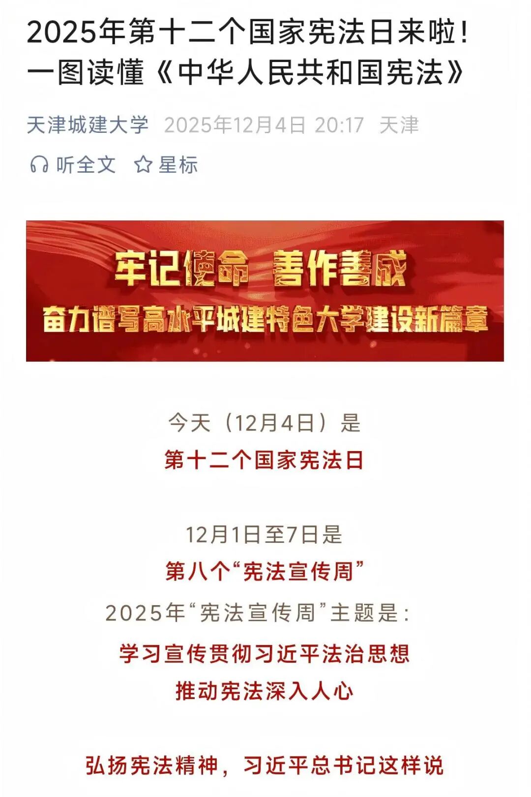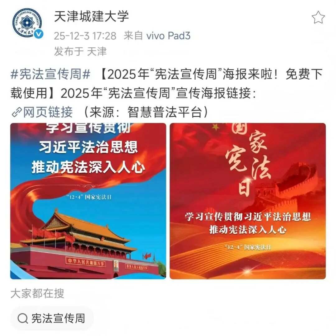 学校依托融媒体矩阵,实现了法治宣传的立体化、全方位覆盖,校、院两级官方微信公众号、官网、微博等平台,第一时间推送“国家宪法日”主题海报,以直观生动的视觉语言点亮网络空间。依托“学习城建”公众号平台,集中推送了习近平总书记关于宪法的重要论述,深刻阐释了宪法作为国家根本法的崇高地位。通过集“视觉渲染”与“理论武装”于一体的立体化宣传,在校园网络空间营造了“抬头见法、指尖学法”的浓厚氛围,让法治理念的声音无处不在。