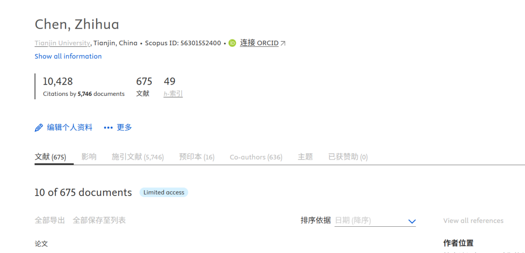 经检索显示,当前Scopus收录陈志华教授论文成果675篇,被5746篇文献引用10428次,H指数49,研究成果在学术界认可度不断攀升。