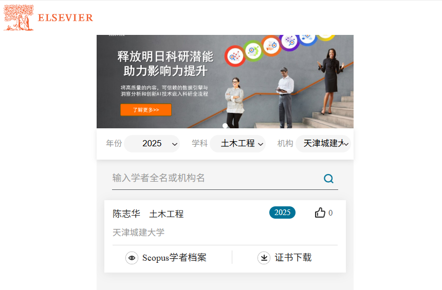 近日,全球知名学术出版机构爱思唯尔(Elsevier)正式发布2025“中国高被引学者”(Highly Cited Chinese Researchers)榜单。副校长陈志华教授凭借在土木工程领域的卓越学术贡献连续第5年入选。此前,陈志华教授已连续6年荣登斯坦福大学全球前2%顶尖科学家榜单。
