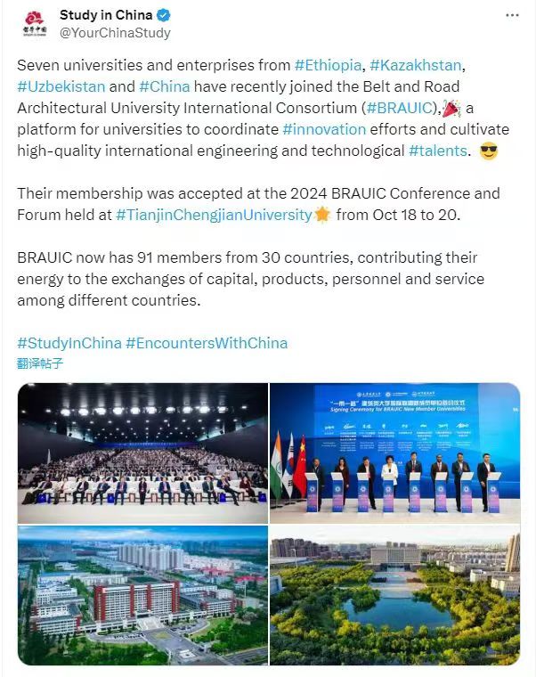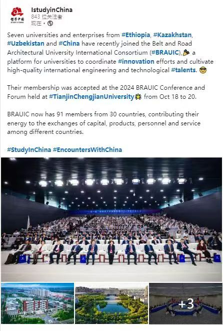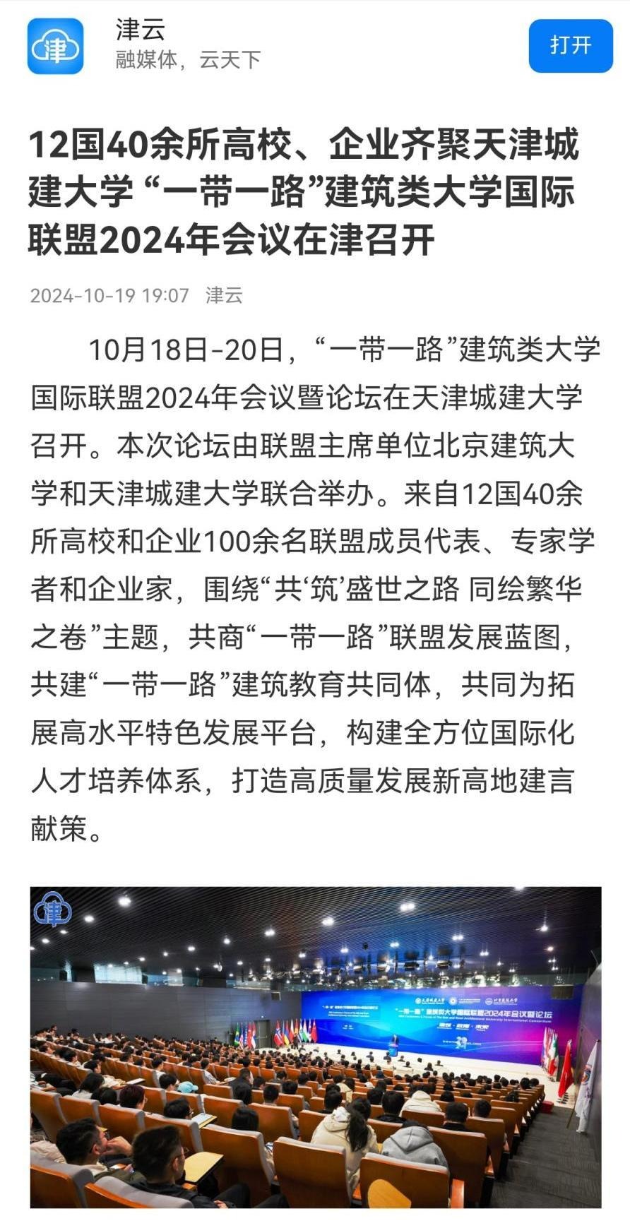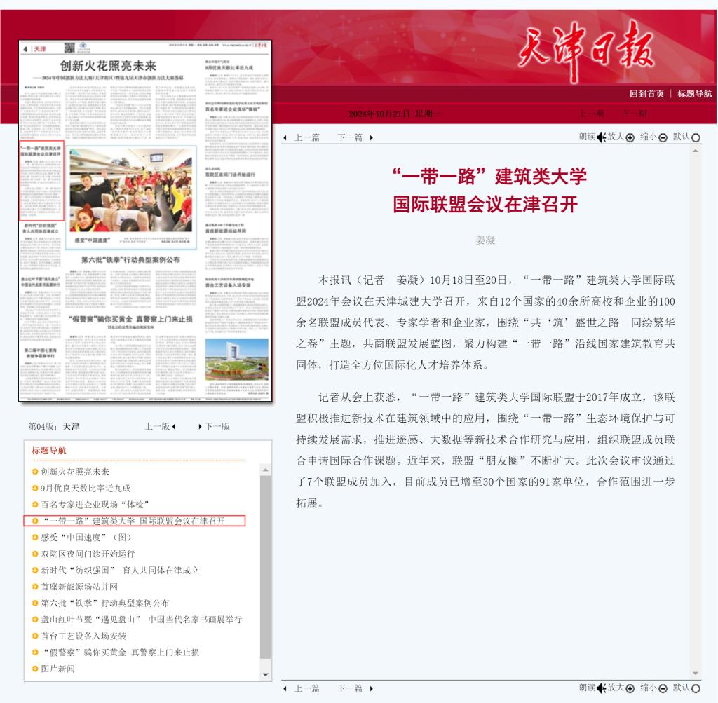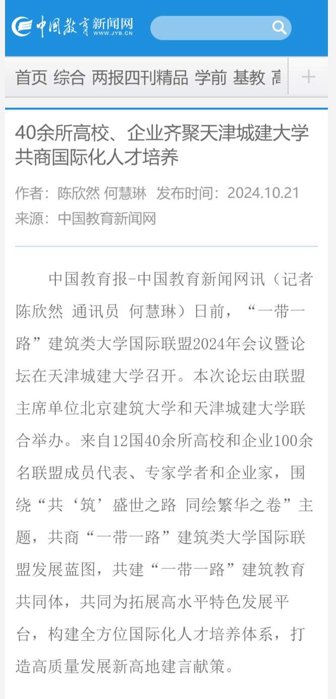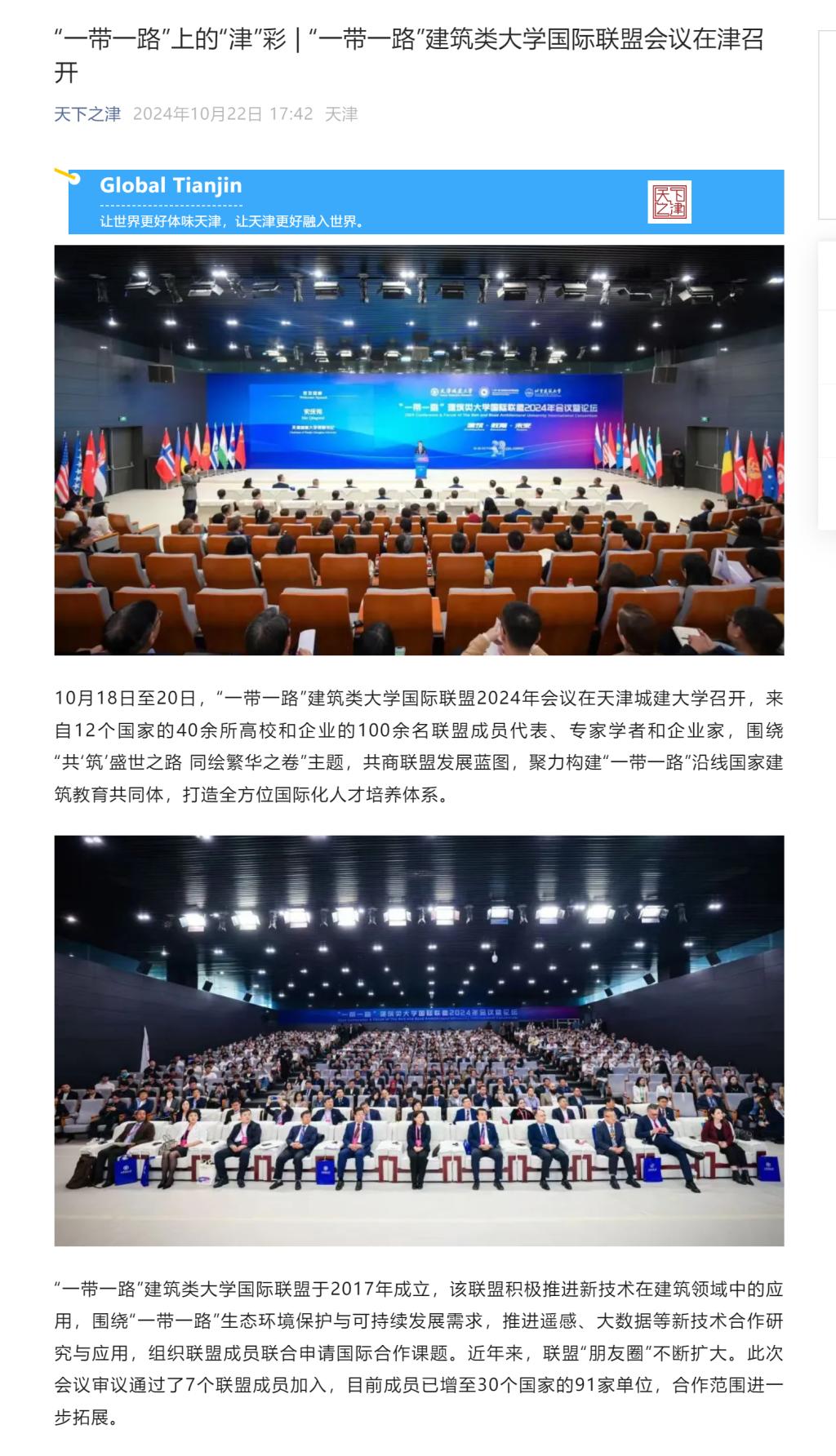 10月18日-20日,“一带一路”建筑类大学国际联盟2024年会议暨论坛在我校隆重召开。来自12个国家的20余位大学校长和企业家、40余所高校与机构的百余名联盟成员代表,围绕“共‘筑’盛世之路 同绘繁华之卷”主题,共商“一带一路”联盟发展蓝图,共建“一带一路”建筑教育共同体,共同为拓展高水平特色发展平台,构建全方位国际化人才培养体系,打造高质量发展新高地建言献策。会议受到了人民日报、新华社、光明日报、中国日报、中国新闻网、中国青年报、中国教育新闻网、天津日报、津云、天津教育报等多家媒体宣传报道。